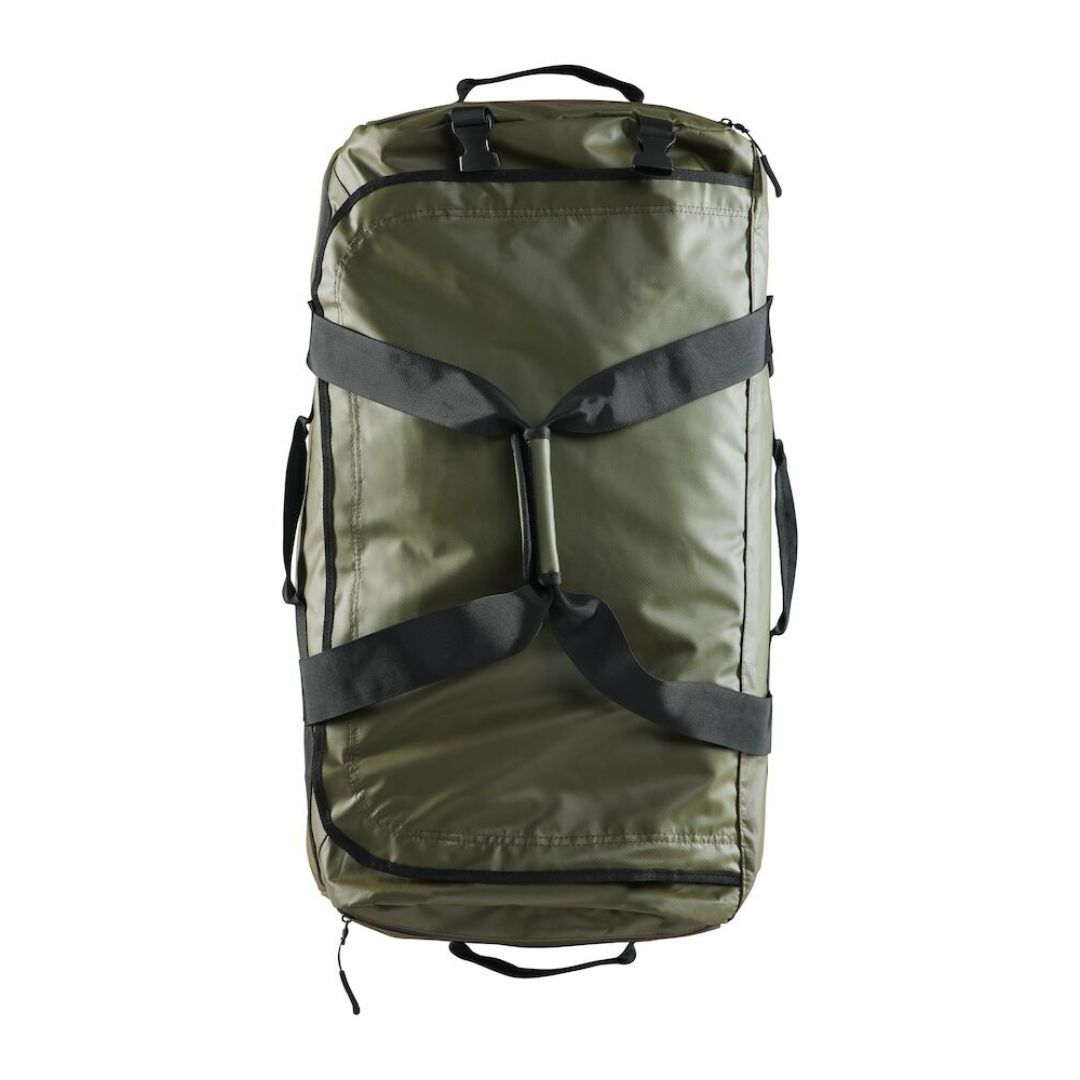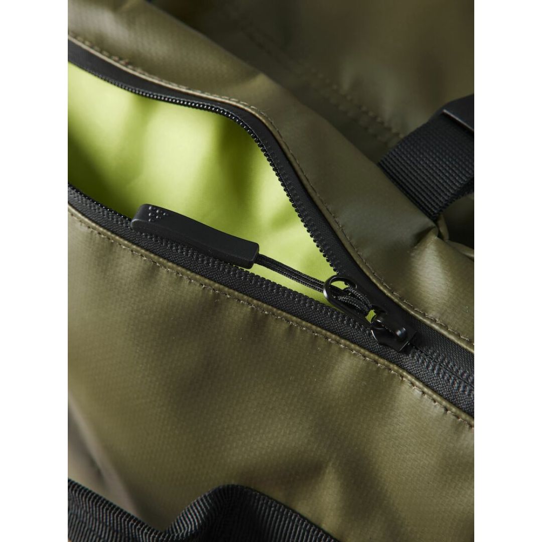Sportstaske som kan bære i hånden med den klassiske hank, men som også kan monteres med skuldrestropper, så den kan løftes på ryggen med god komfort for ryggen. Skulderstropperne kan opbevares i tasken i en lomme til dem, når de ikke er i brug. Universal taske med vandtætte lynlåse og to sidelommer. D-formet åbning og en mesh lomme med lynlås.