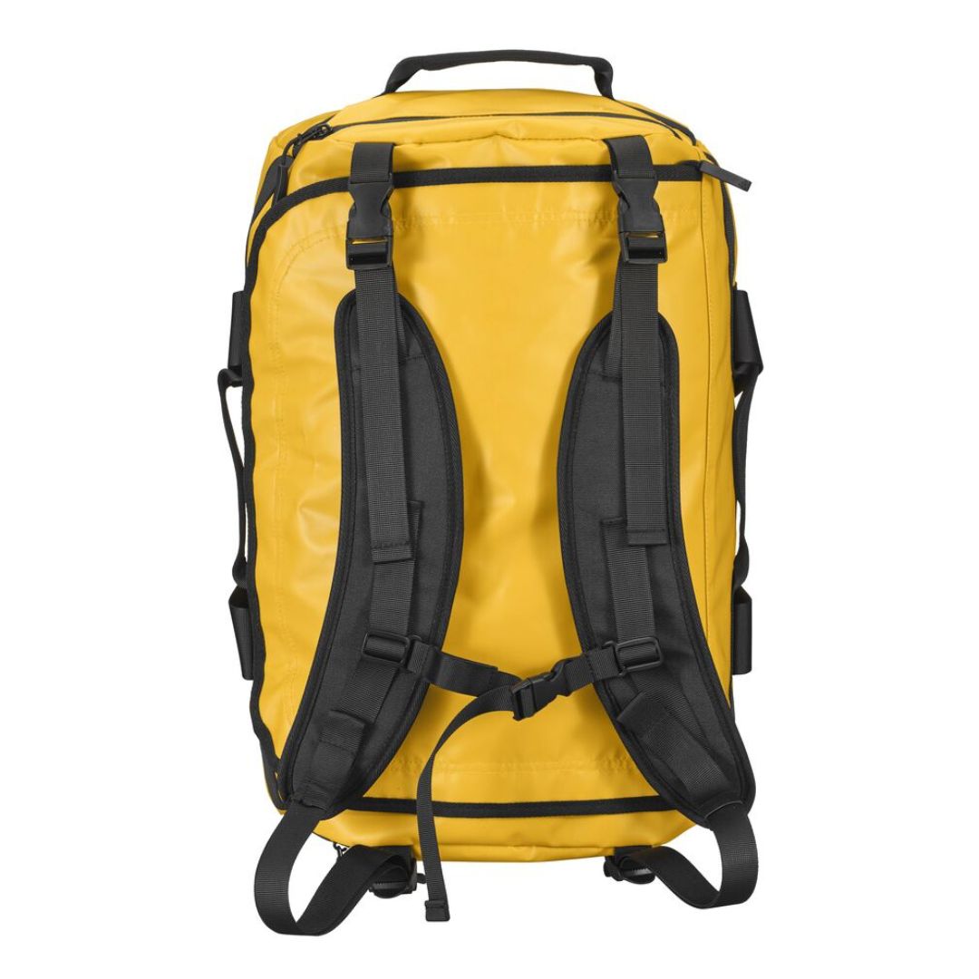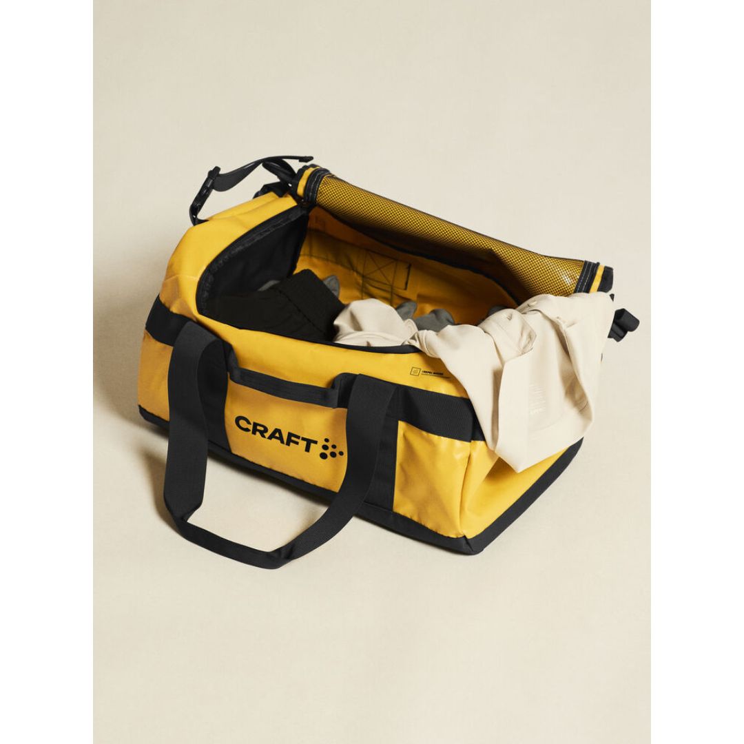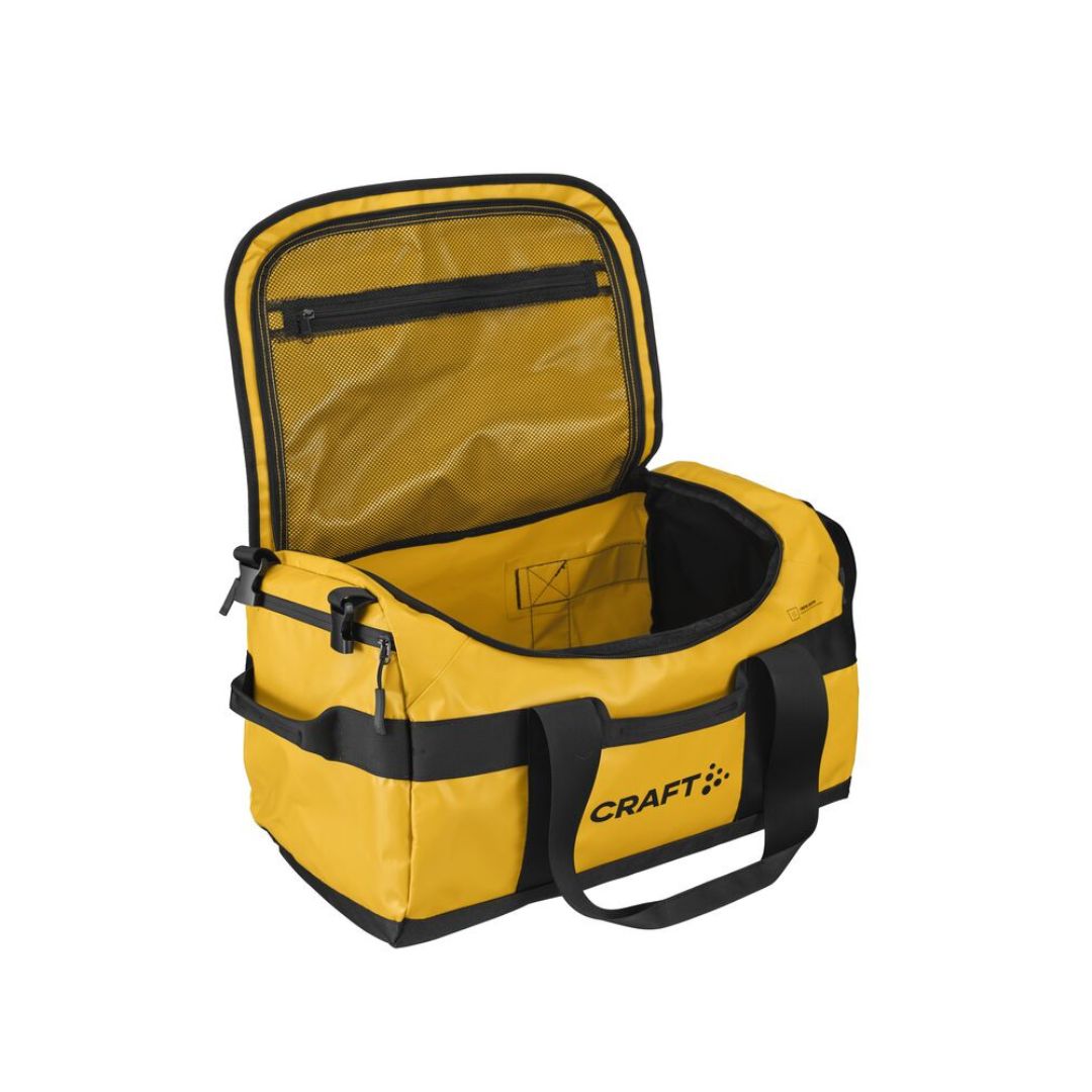 Sportstaske som kan bæres i hånden med den klassiske hank, men som også kan monteres med skulderstropper, så den kan løftes på ryggen med god komfort for ryggen. Skulderstropperne kan opbevares i tasken i en lomme til dem, når de ikke er i brug. Universal taske med vandtætte lynlåse og to sidelommer. D-formet åbning og en mesh lomme med lynlås.