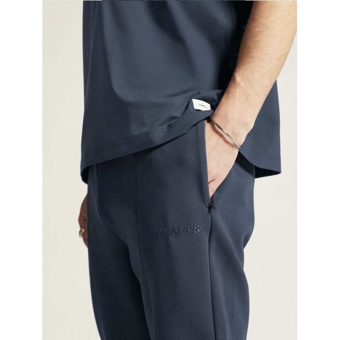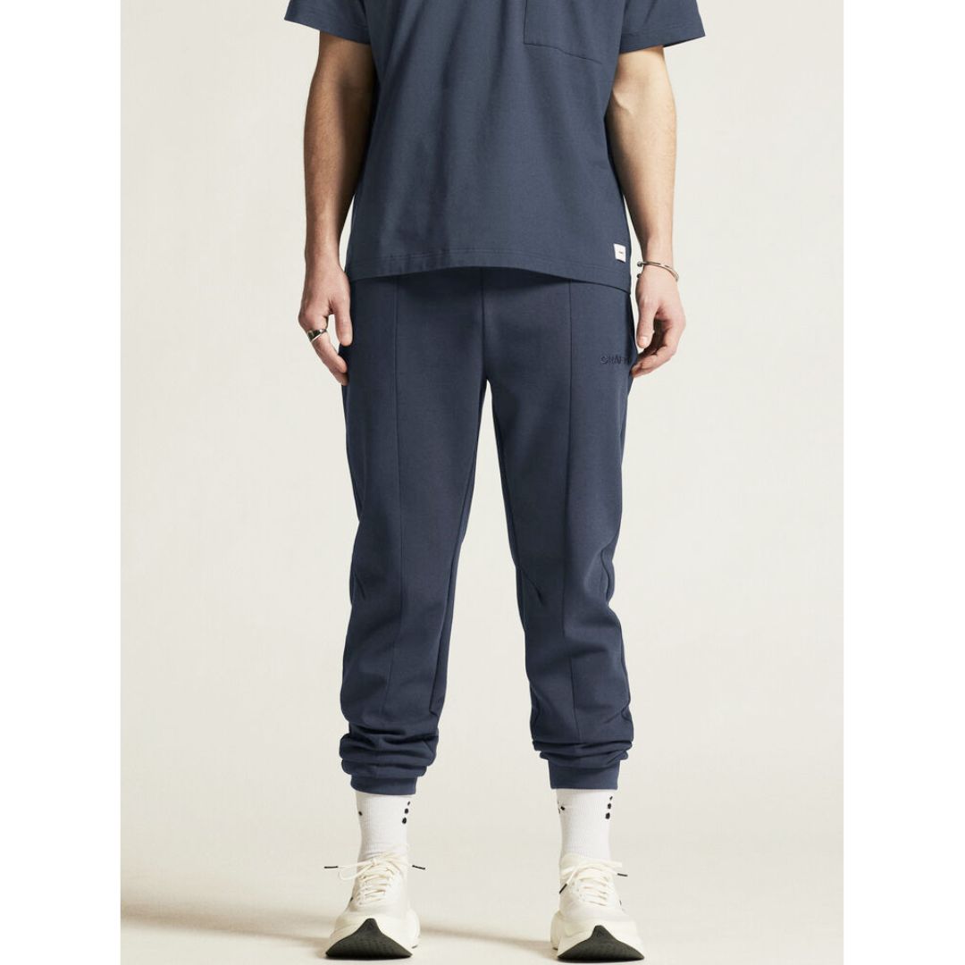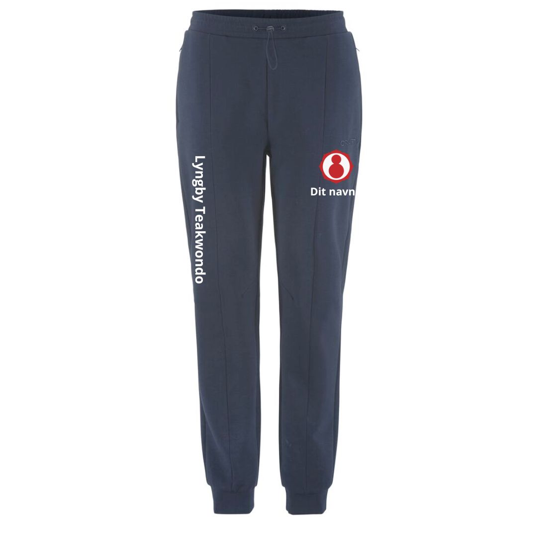 Tætsiddende jersey bukser i bomld med læg foran. De har bomuld udvendig og polyester indvendigt. De har elastik linning med justerbar træksnor. Elastik søm ved anklerne og i siderne er der to lommer med lynlås.
