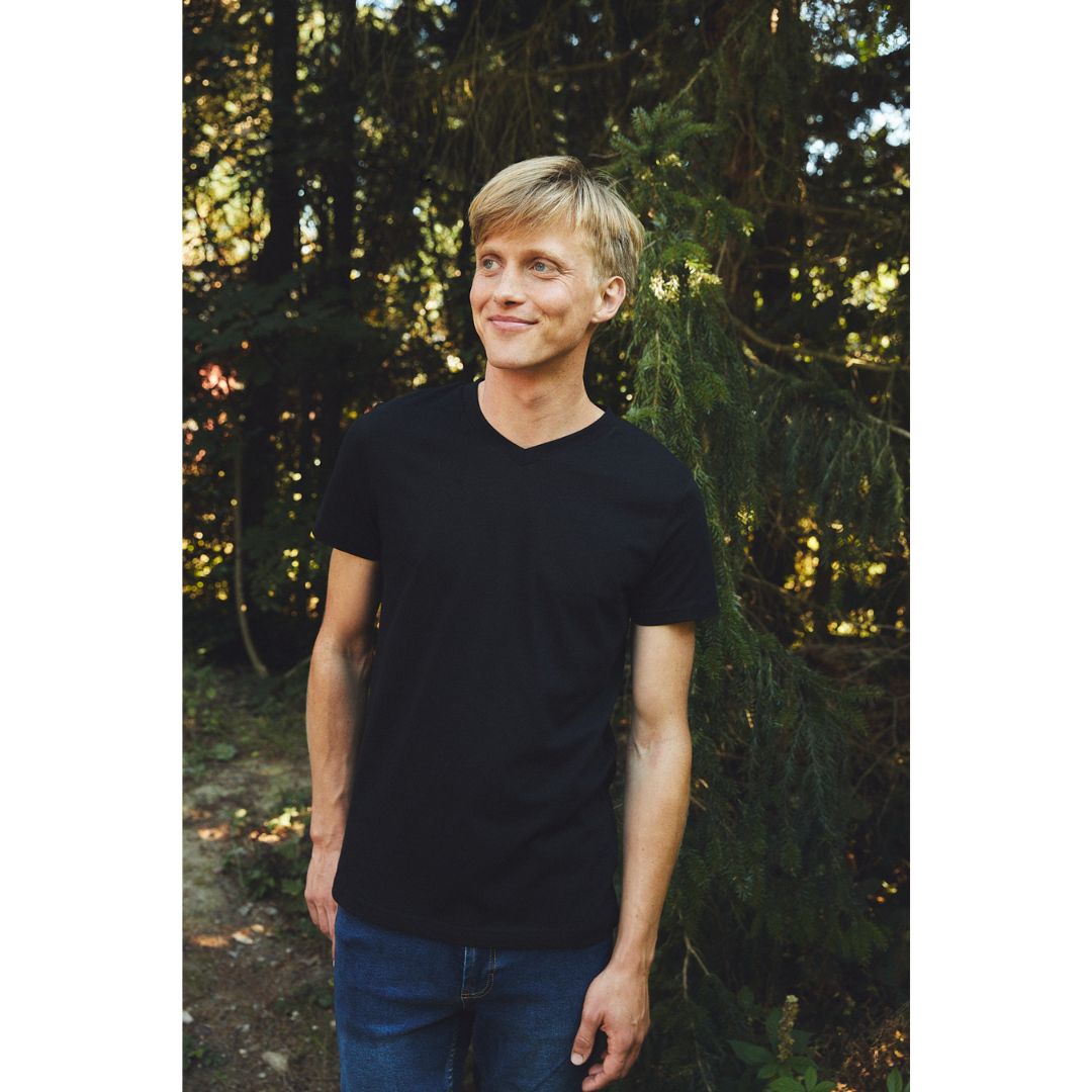 Single jersey v-hals t-shirt i et let figursyet form omkring skuldrene og et mere løst look omkring torsoen. Den er fremstillet i et blødt letvægts materiale.