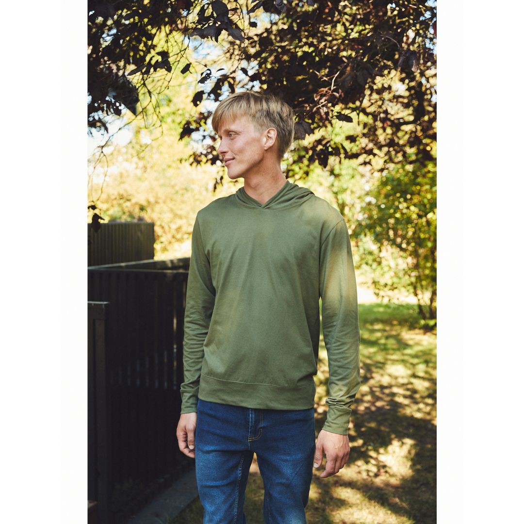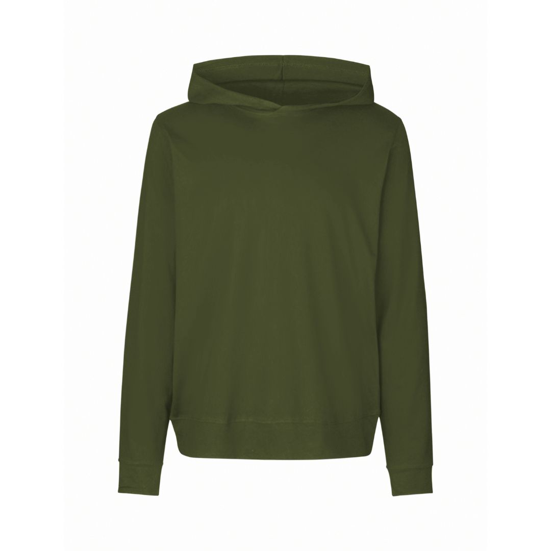 Hoodie i et unisex design med dobbelt foret hætte. Der er dobbelt kant i bunden af i ærmerne for at give en god pasform. Den er i en lidt smal pasform og fremstillet i er blødt letvægtsmateriale.