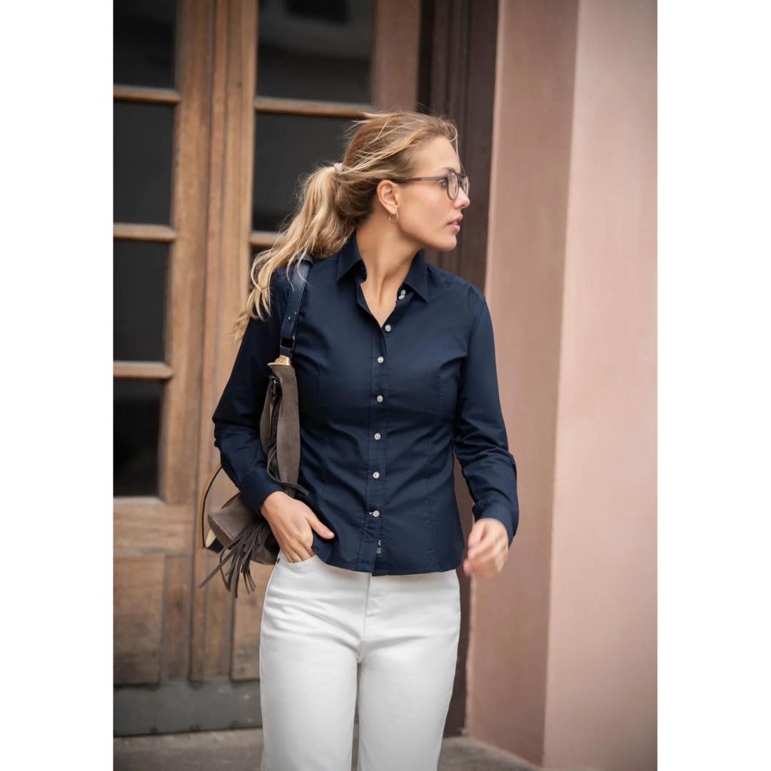 Skjorte med marmorknapper og feminin knaplukning. Tonede kontrastdetaljer og klassiske detaljer. Skjorte med justerbare manchetter og kurvet søm.