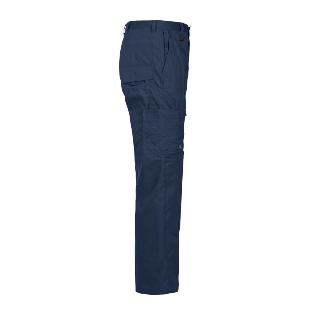 Bukser med sidelommer foran, sikkerhedslomme på højreside med lynlås. To baglommer og to lårlommer. Den venstre lomme på låret har en klap og indvendig telefonlomme. Højre lårlomme har plads til kuglepen, papir og tommestok. D-ring i front. Bukserne er uden læg og har indvendig knælommer.