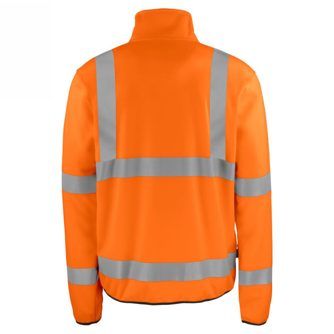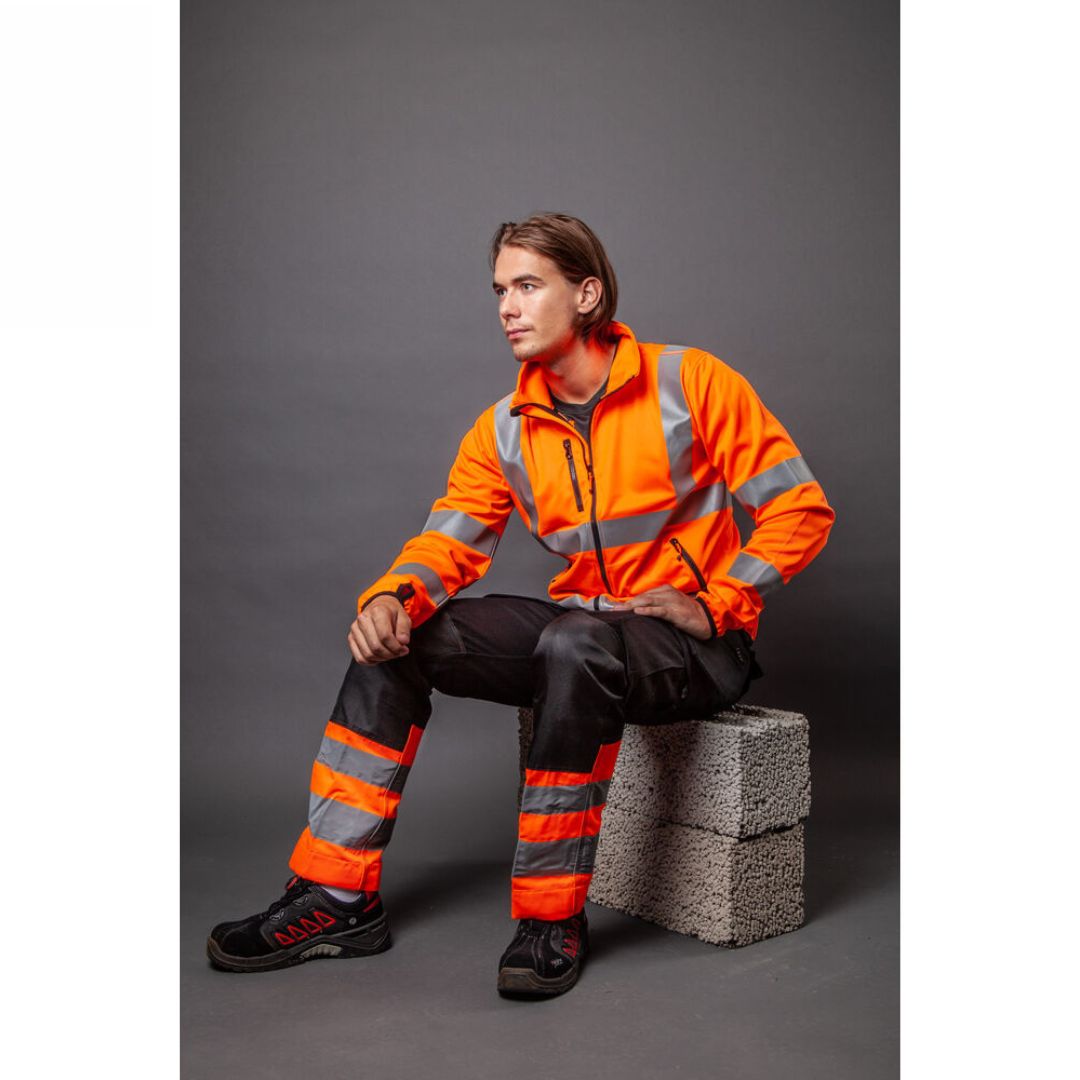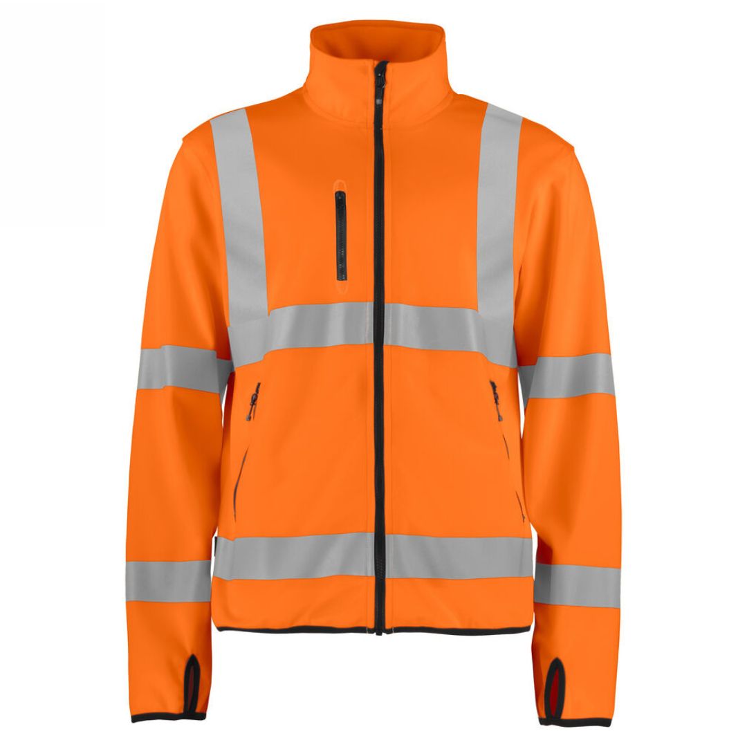Softshellejakke i et let materiale med gennemgående lynlås og indvendig vindbeskyttelse. Jakken har en brystlomme/mobil telefonlomme med lynlås. Foran er der to lommer med lynlås. Elastik i bunden og i manchetter og hul til tommelfingeren.